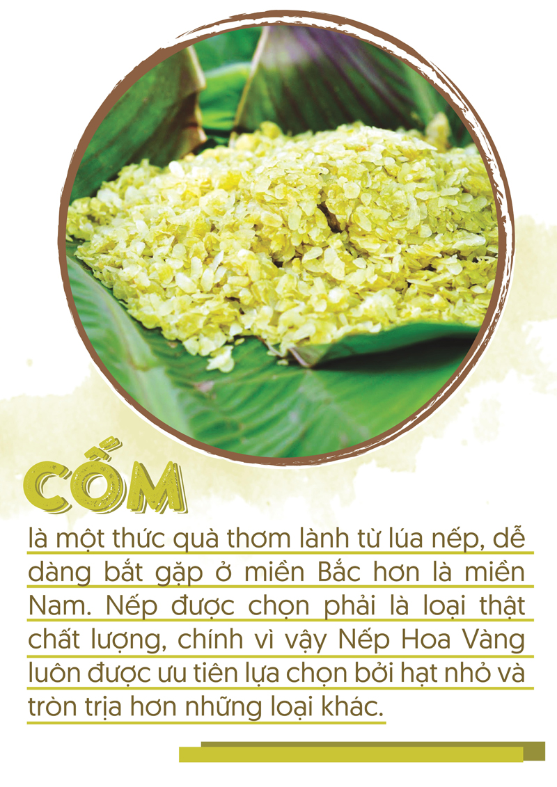 Nếp được chọn phải là loại thật chất lượng, chính vì vậy nếp hoa vàng luôn được ưu tiên lựa chọn vì hạt nhỏ và tròn trịa hơn những loại khác. Trải qua các công đoạn sàng, rang rồi giã thật đều tay, tốn rất nhiều thời gian và công sức, thành quả thu được là loại hạt nếp dẹt, mềm, xanh nhạt và thơm một mùi dịu nhẹ. Mỗi quy trình đều được chăm chút kỹ lưỡng để có được từng hạt cốm chất lượng, như thế mới có thể chế biến ra những món ăn thật ngon.