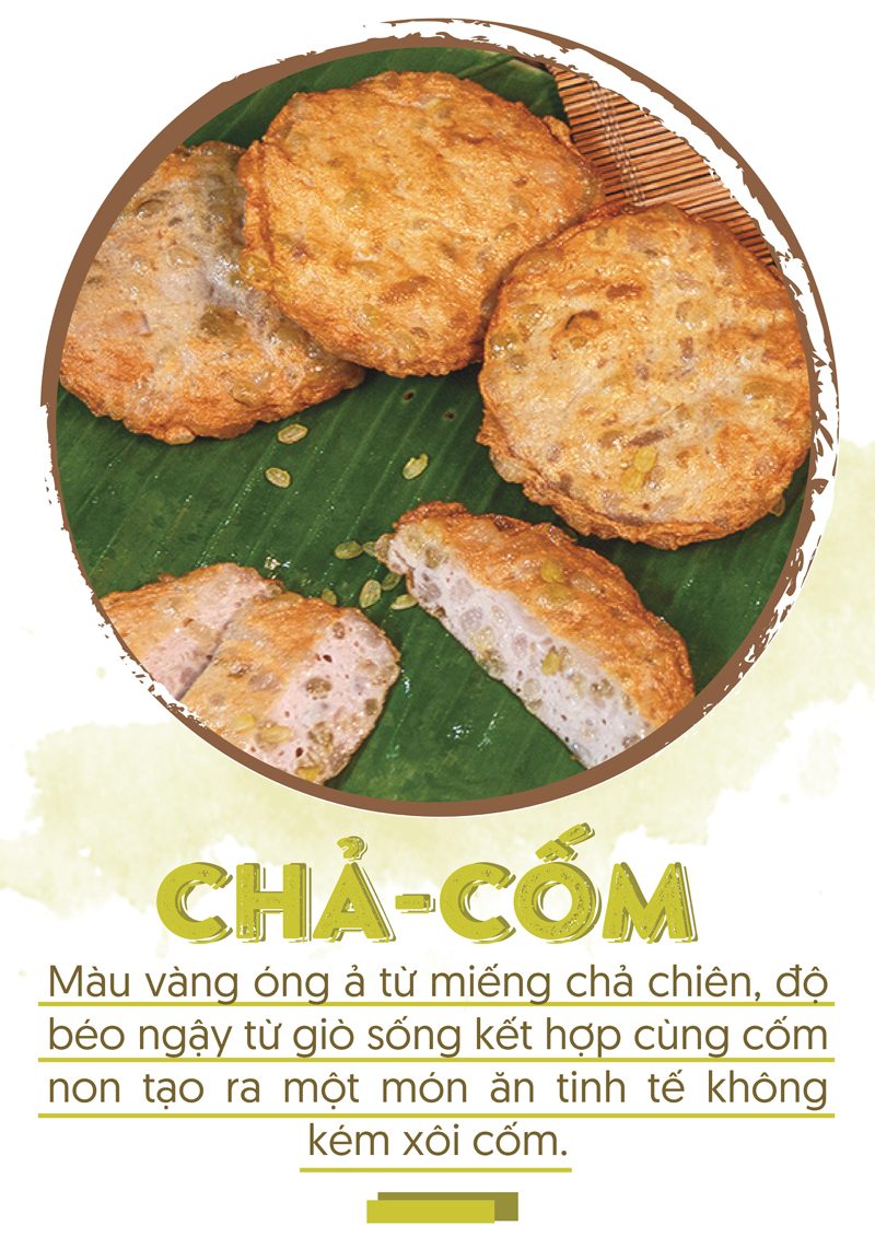Chả cốm cũng là một thức quà dễ tìm thấy trên những mâm cỗ ngày thu. Vẫn là những nguyên liệu quen thuộc như giò sống, nước mắm, gia vị, nhưng được điểm xuýt thêm cốm non đặc biệt từ làng Vòng, vậy là món ăn đã khác biệt hơn hẳn. Các nguyên liệu được trộn với nhau thật kỹ, nêm nếm cân chỉnh gia vị rồi nặn thành hình tròn dẹt và được hấp sơ trước khi mang đi chiên vàng. Màu vàng óng ả từ miếng chả chiên, độ béo ngậy từ giò sống kết hợp cùng cốm non tạo ra một món ăn tinh tế không kém xôi cốm.