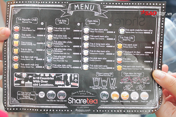 Thực đơn quán khá đơn giản với các loại trà sữa cơ bản, an toàn và có thể dễ dàng tìm thấy trong các thương hiệu trà sữa đang có mặt tại Sài Gòn. So sánh với menu của Sharetea với các nước trên thế giới thì Sharetea Vietnam có số lượng món uống ít hơn hẳn, lược bỏ khá nhiều các thức uống sáng tạo và mới lạ so với các cửa hàng anh em của mình.