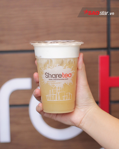 Đầu tiên là Trà xanh Kem sữa. Phần kem sữa làm mình rất bất ngờ. Kết cấu kem sữa rất đặc, tương đương sữa chua Hy Lạp và có vị đậm đà. Có thể nói ở Sài Gòn hiện nay, kem sữa của Sharetea có độ đậm đặc và dày kem bậc nhất. So với các thương hiệu trà sữa khác, kem sữa béo hơn, mặn hơn và cũng ngọt hơn.