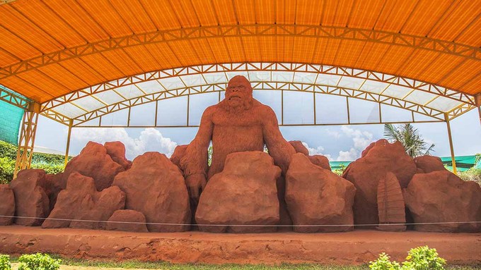 Sau một thời gian dài khảo sát, các nhà khoa học quốc tế đã khẳng định, chất lượng cát ở Mũi Né (Phan Thiết) đạt yêu cầu để làm nguyên liệu cho nghệ thuật điêu khắc trên cát. Loại hình này còn mới mẻ ở Việt Nam nhưng đã rất phổ biến trên thế giới. Trong ảnh là tượng cát “King Kong” nằm ngay cửa vào công viên.