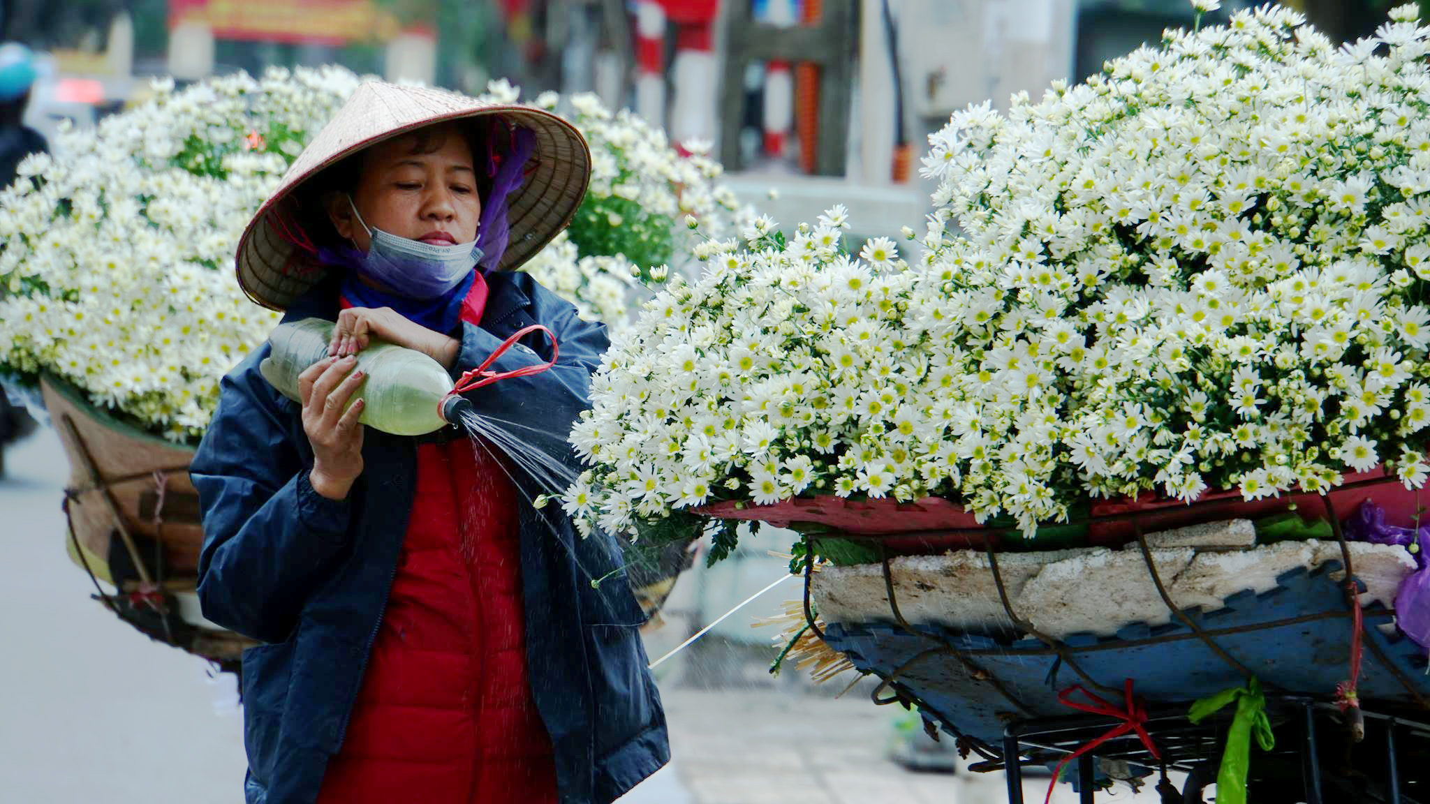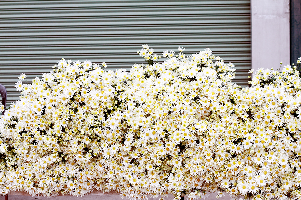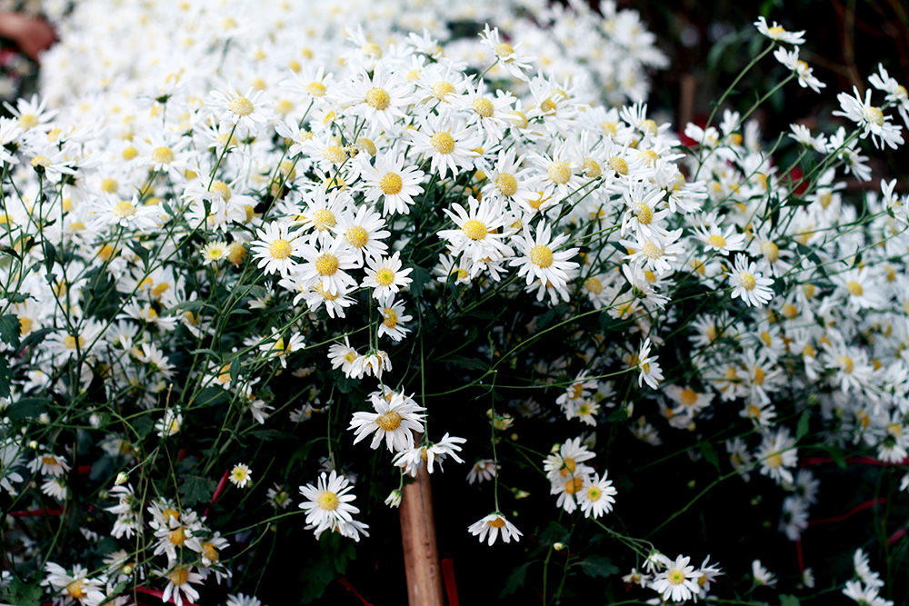 Những xe hàng rong chở họa mi cuối mùa trên đường phố Hà Nội. Chỉ còn vài ngày nữa, hầu hết các vườn hoa đã cắt hết để trồng hoa Tết. Đầu tháng 12, cúc họa mi vẫn còn rong ruổi trên từng con phố, từng góc chợ của Thủ đô. Những gánh hoa trắng ngần, nhụy vàng tươi níu chân bất kỳ người phụ nữ nào đi qua. Chính vì thế mà những ngày này, ở Hà Nội, từ văn phòng công sở, căn hộ riêng hay các nhà hàng, khách sạn… người ta đều bắt gặp một bình cúc họa mi - bình dị - nhưng đẹp một cách thanh tao.