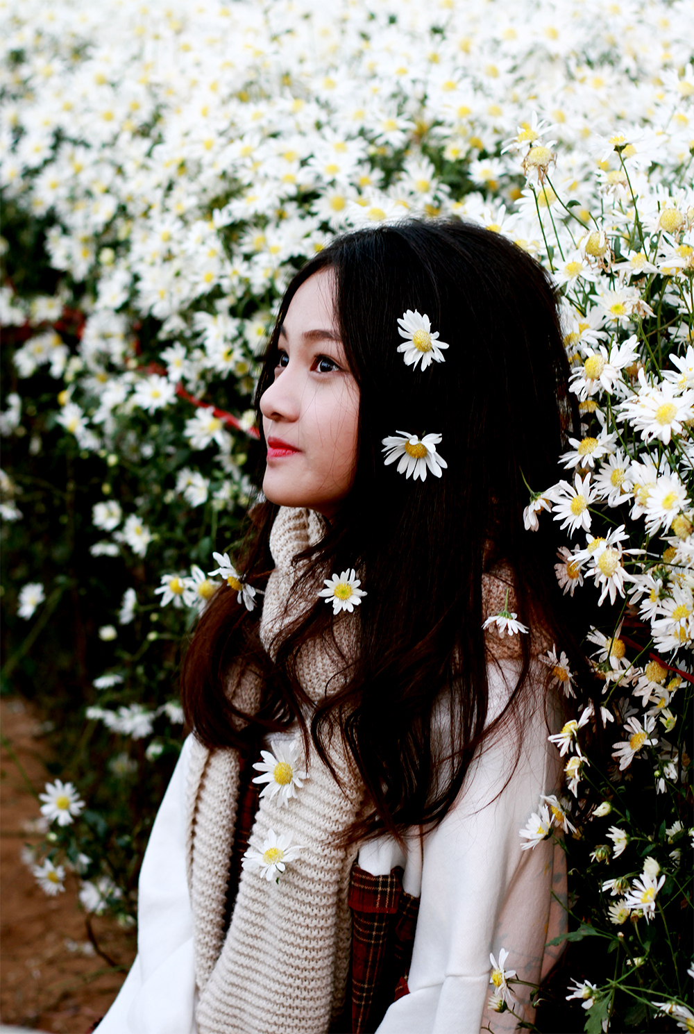 Những cánh hoa vương vấn trên mái tóc thiếu nữ.