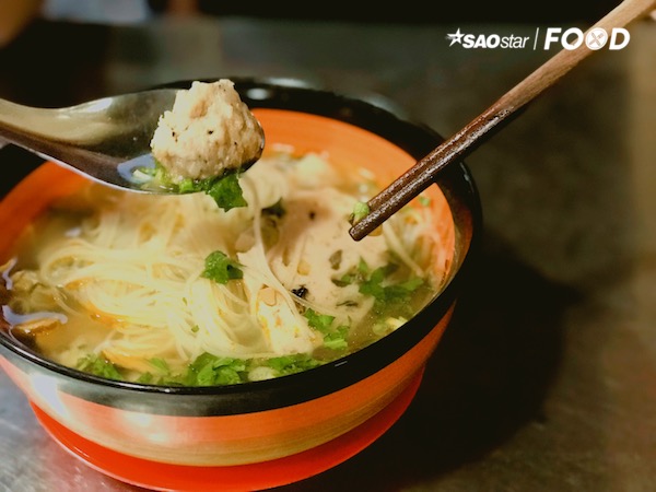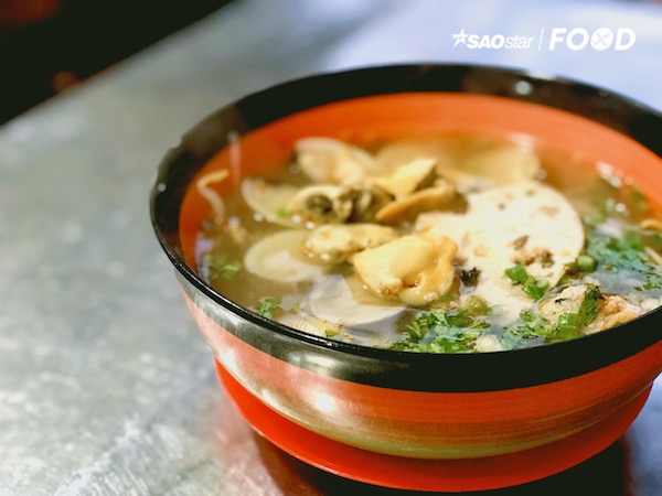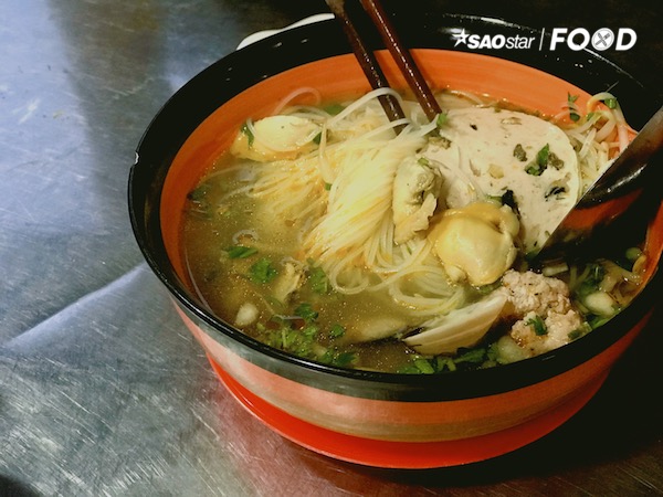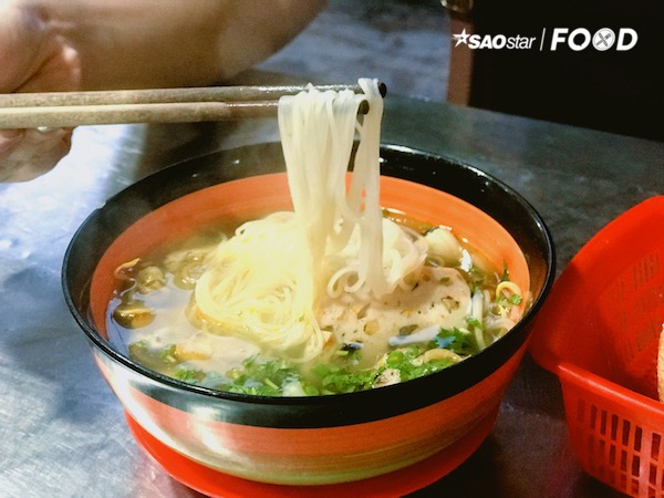 Bên dưới lớp thức ăn nào nghêu, nào ốc rồi sò và chả là sợi bánh hủ tiếu nóng và thơm lừng. Hủ tiếu dai mịn vừa ăn vừa húp cùng nước dùng hơi cay cay vị sả ớt sẽ khiến bạn “toát mồ hôi” đấy.