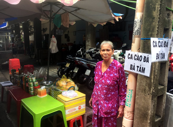Bà Tám làm không ngơi nghỉ. Bà múc một vá ca cao đặc chế vào chiếc ly đầy đá. Thêm một muỗng ca cao loãng và nếu cần một chút sữa nữa là có một ly ca cao ngon lành. Bà mang cho khách kèm theo một ổ bánh mì.