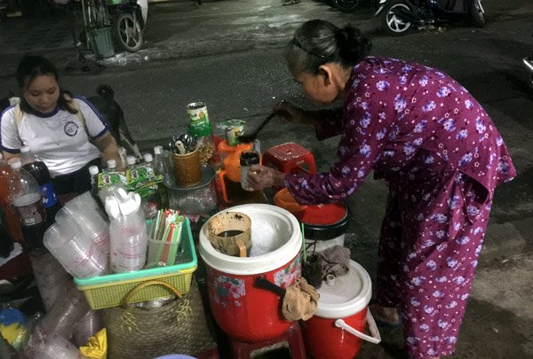 Vào giờ tan trường, học sinh các trường lân cận ghé vào thưởng thức rất đông. Ngồi trên chiếc ghế thấp, khách khuấy nhẹ, xé một mẩu bánh mì bỏ vào ly rồi dùng muỗng múc ăn.