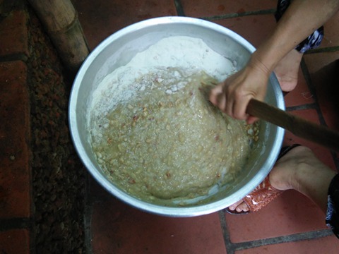 Bỏng nếp sau đó phải được xay mịn. Mật mía trộn đều với mạch nha rồi nấu trên lửa nhỏ cho đến khi sánh lại. Những người thợ sẽ nhẹ nhàng trộn bột nếp với những lát gừng thái mỏng cộng thêm lạc giã.