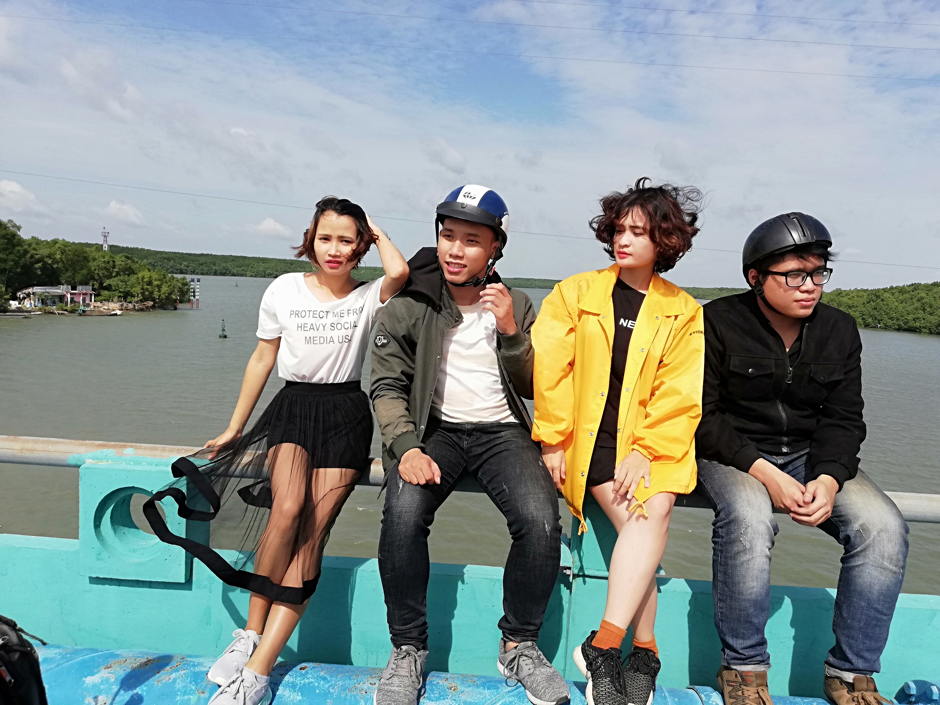 Một nhóm bạn tạm dừng tại một cây cầu ven đường đi để check - in