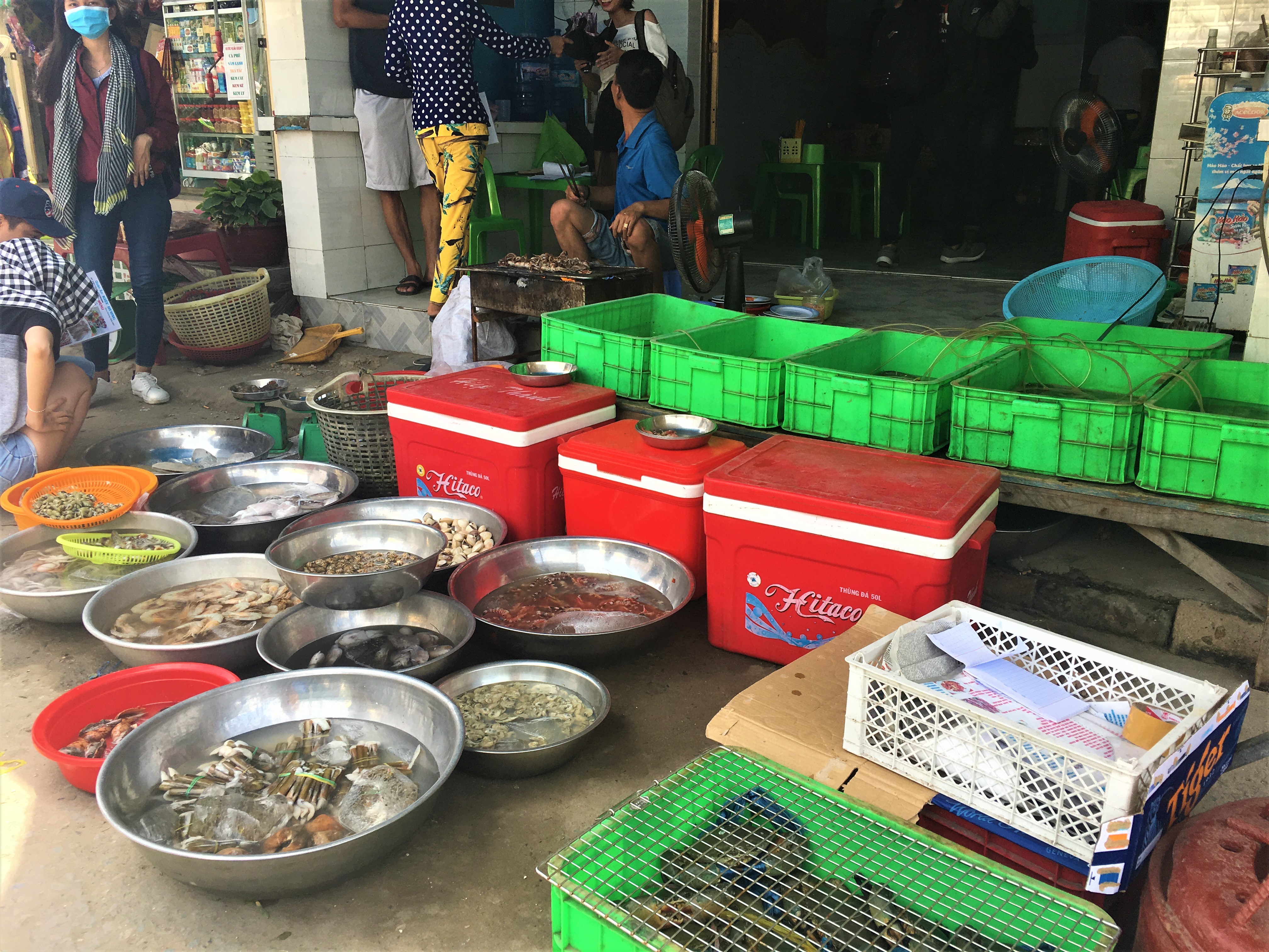 Hải sản được người dân bày bán trong ngày, phía bên trong là khu chế biến và quán ăn