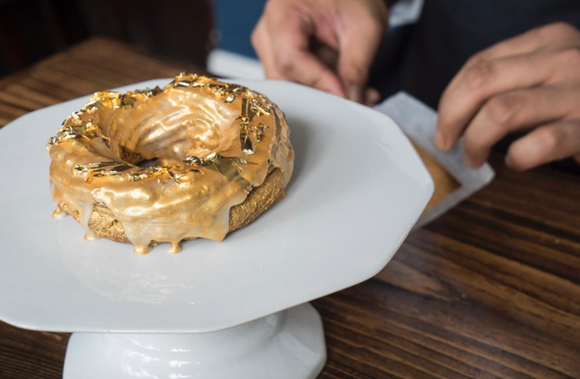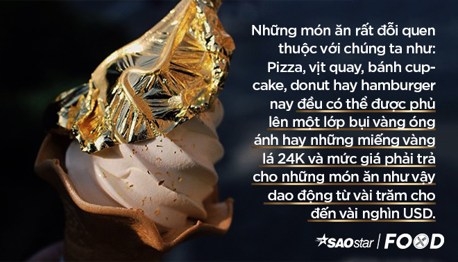 Tưởng chừng như việc dát vàng lên những vật dụng hàng ngày là đã hết mức xa xỉ nay giới thượng lưu lại có thú chơi ẩm thực dát vàng. Những món ăn rất đỗi quen thuộc với chúng ta như: pizza, vịt quay, bánh cupcake, donut hay hamburger,… nay đều có thể được phủ lên một lớp bụi vàng óng ánh hay những miếng vàng lá 24K và mức giá phải trả cho những món ăn như vậy dao động từ vài trăm cho đến vài nghìn USD.