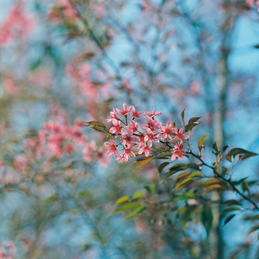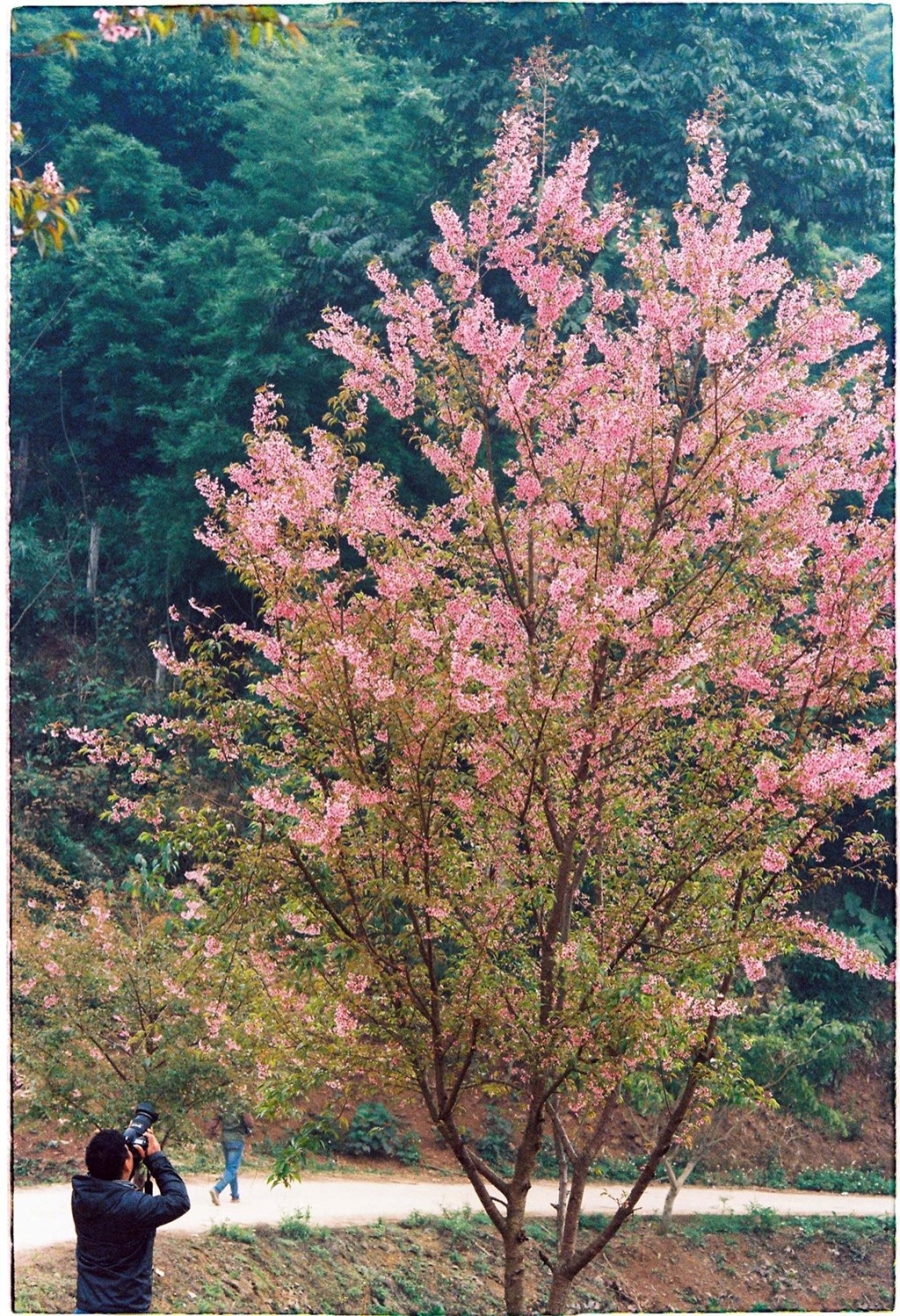 Người dân cho biết loài mai anh đào được mang giống từ Nhật Bản về. Do thời tiết và thổ nhưỡng, loài hoa này trổ nhiều lá hơn, nhưng hoa vẫn giữ nguyên sắc thắm.
