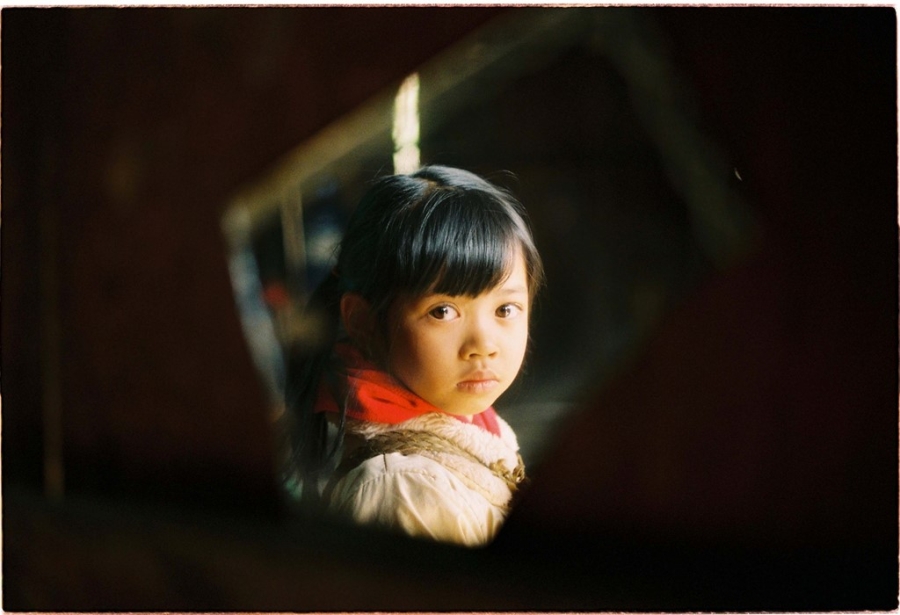 Một em bé soi mình trong tấm gương vỡ, món đồ chỉnh đốn trang phục của cả gia đình.