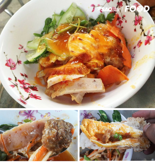 Tô thức ăn đầy đủ thành phần, nào là trứng chiên, chả cá, thịt nướng, chả lụa, trứng cút,… khiến bạn 'nuốt nước miếng' khi được bày ra. Thành phần trong món ăn trông có vẻ không ăn nhập nhưng lại tạo nên sự kết hợp tuyệt vời khi được hoà trong làn nước sốt sệt và đậm vị do chính chủ quán chế biến.