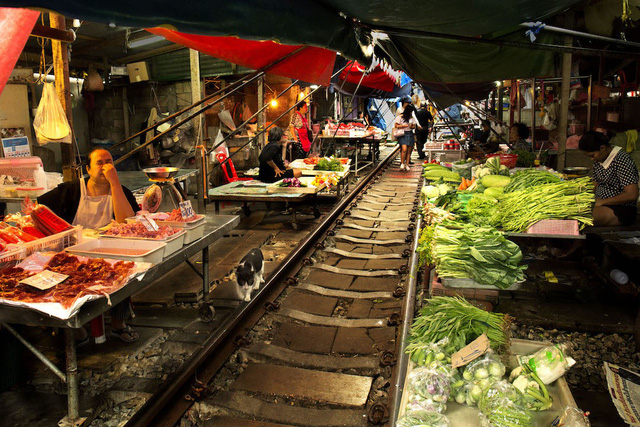 Chợ Maeklong ở Samut Songkhram, cách thủ đô Bangkok 60 km một điểm đến hấp dẫn cho những khách du lịch bụi muốn một lần trải nghiệm sự nguy hiểm. Đó là khu chợ trời dài gần 500 m, nằm trên đoạn đường ray đang hoạt động và có tuổi đời hơn 100 năm ở Thái Lan. Bởi vậy, du khách vẫn gọi nó với cái tên dân dã hơn “chợ đường tàu”.