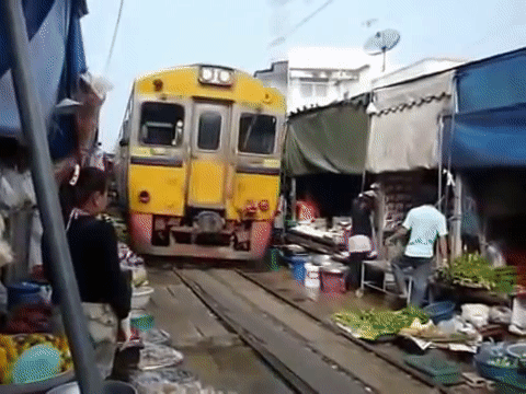 Trước giờ tàu chạy qua, họ nghe thấy tiếng chuông báo kéo dài 3 phút. Và trong 3 phút ngắn ngủi đó, tất cả phải thu dọn sạch sẽ để nhường đường cho tàu qua. Chợ chỉ tạm dừng hoạt động trong đôi phút là khi tàu chạy xuyên qua. Ngay sau đó, cảnh mua bán lại diễn ra như thường lệ. Các tiểu thương tiếp tục đưa sạp hàng bày bán trên đường ray.