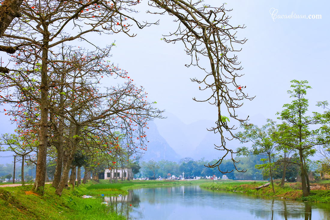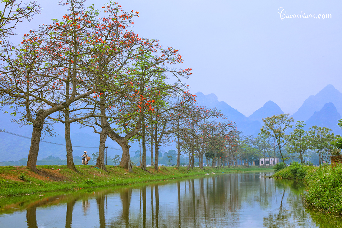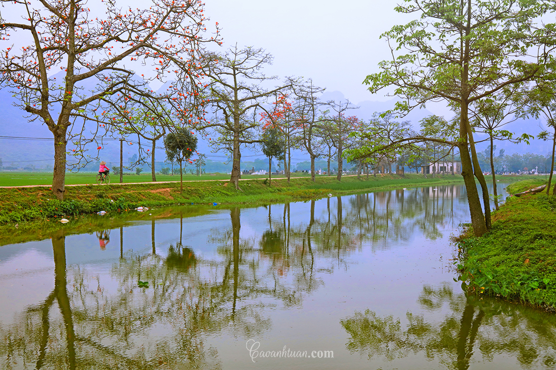 Mỗi mùa tháng Ba, những sắc hoa gạo lại bừng sáng khiến người ta phải nao lòng. Hình ảnh cây gạo đang độ ra hoa soi bóng xuống dòng nước tạo nên cảnh sắc thanh bình của làng quê.