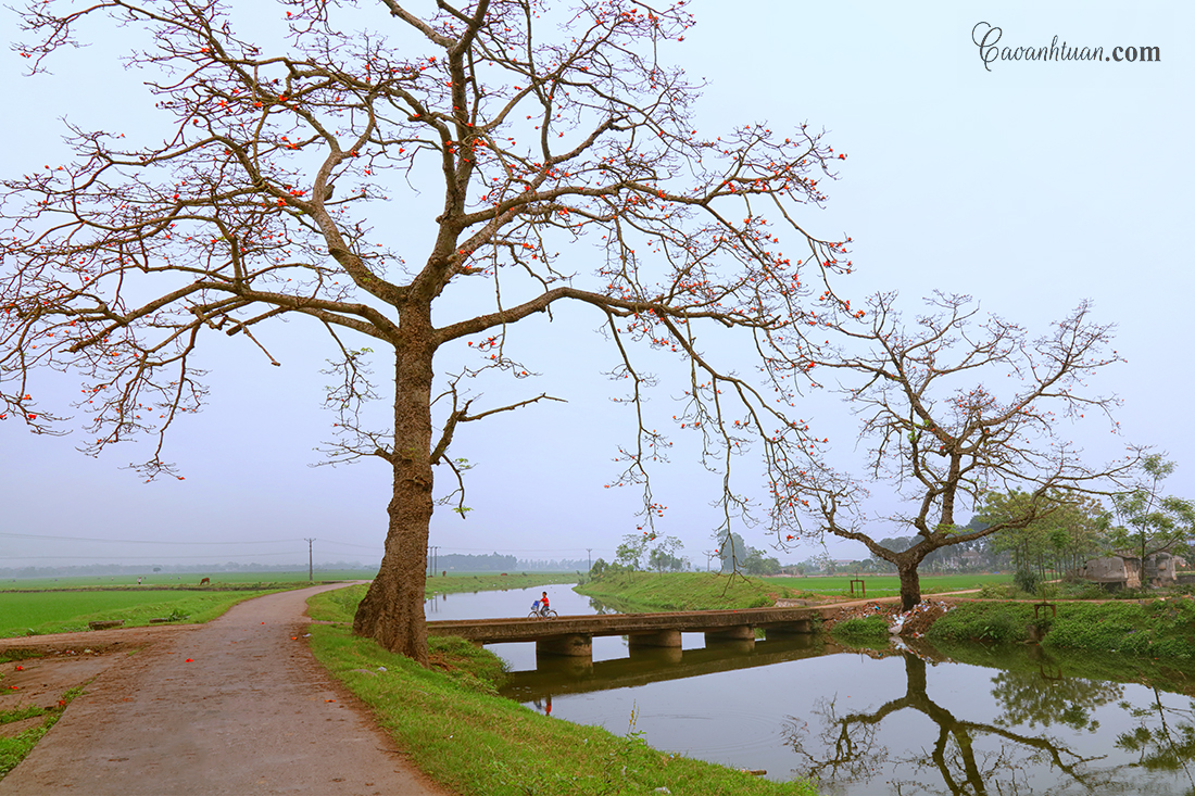 Về thôn Đoan Nữ, xã An Mỹ, huyện Mỹ Đức, Hà Nội những ngày này, trên những dáng cây khẳng khiu, hoa gạo nở thành chùm đỏ tươi trên lưng trời. Sự kết hợp hài hòa của hoa, những con đường làng, con mương, cánh đồng lúa… tạo nên bức tranh thiên nhiên làng quê thanh bình, đẹp đến ngẩn ngơ.