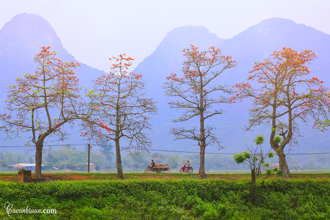 Rặng cây hoa gạo chạy dài tít tắp ở thôn Đoan Nữ.