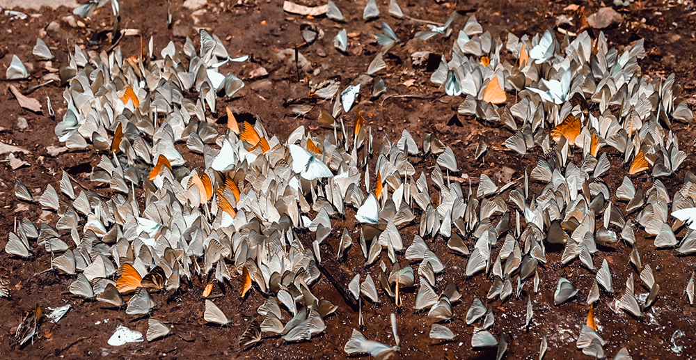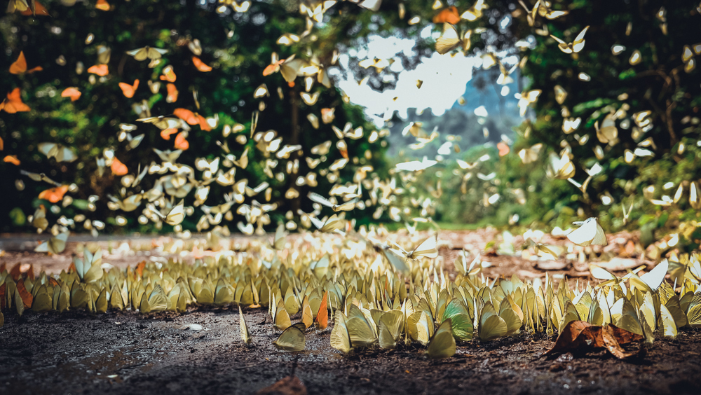 Vào đến giữa rừng, từng đàn bướm tụ lại bên những bãi đất. Càng vào sâu bên trong, khi con đường đến cây chò ngàn năm chỉ còn chừng vài kilômet, bướm xuất hiện càng nhiều. Khi có bước chân người đến, hàng trăm cánh bướm đủ màu sắc bay lên trong nắng.