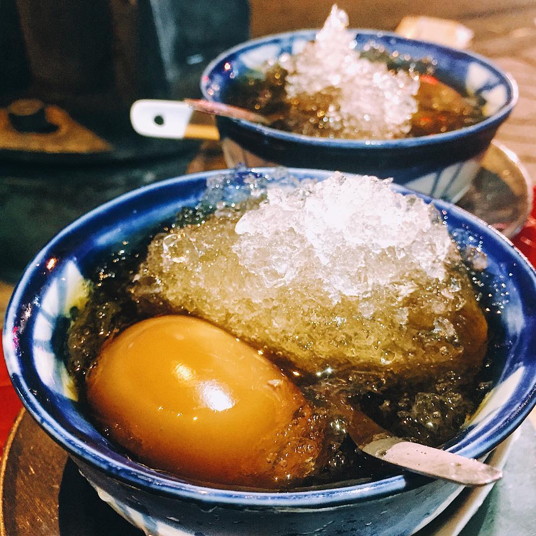 Món trà hột gà ăn khá lạ miệng, trứng gà luộc được hầm chung với nước trà, khi trà thấm vào bên trong trứng ăn sẽ không còn thấy mùi tanh nữa mà lại cảm nhận được vị bùi béo của trứng lại thơm thơm vị trà. Miếng đu đủ tiềm mềm nhừ, ngọt thanh ăn rất mát.