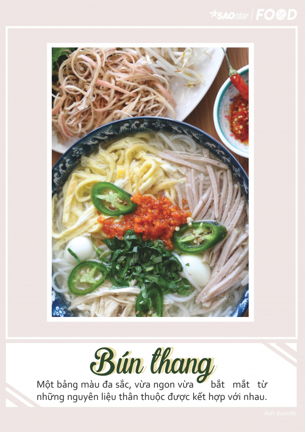 Một thức quà nữa đến từ miền Bắc. Người ta biết đến bún thang như một món ăn thanh đạm dùng sau Tết. Những nguyên liệu được bày biện gọn ghẽ trên tô bún đều là phần còn xót lại sau những ngày làm cỗ đón năm mới. Mọi thứ đều được xắt nhỏ, tỉ mỉ, mỗi phần một ít như thang thuốc, chính vì vậy mà cái tên bún thang được ra đời. Cũng nhờ có nhiều nguyên liệu như vậy mà tô bún thang trông như một bảng màu đa sắc từ trứng chiên vàng ươm, thịt gà trắng, giò lụa hồng, củ cải màu vàng, đến sắc nâu của nấm hương và ruốc tô. Nhất định không thể thiếu được sắc xanh của hành lá, rau răm và xen kẽ một chút hành phi giòn, ớt đỏ rắc trên cùng.