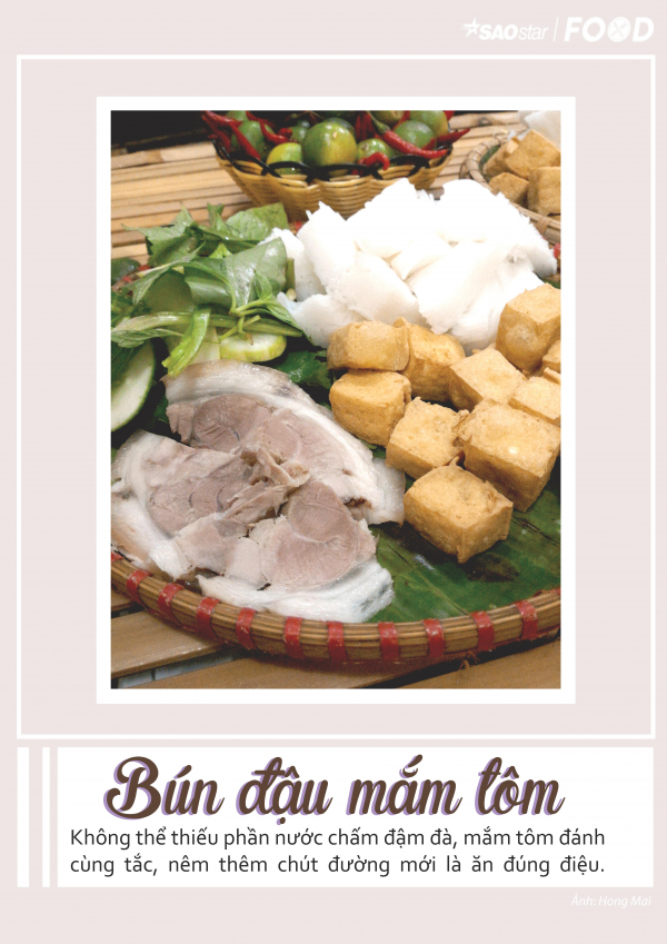 Bún đậu mắm tôm tuy xuất xứ từ miền Bắc nhưng cũng đã trở nên vô cùng thân thuộc với người Sài Gòn. Người ăn bị mê hoặc bởi một mẹt lớn đầy rau sống, bún tươi, thịt luộc, đậu phụ và chả cốm vàng ươm, nóng hổi. Ngon là ngon ở phần thịt heo được luộc vừa chín tới, đậu phụ mềm và mọng nước, chiên giòn mà không bị khô, miếng chả cốm béo ngậy, rồi tất cả những vị ấy hòa cùng với sự đậm đà của mắm tôm, khiến người ăn khó lòng mà quên được. Mắm tôm được pha cùng với tắc và đường để cân bằng lại vị mặn, thêm chút ớt cay là hoàn chỉnh. Một trong những món ăn gây thương nhớ Thủ đô chính là đây.