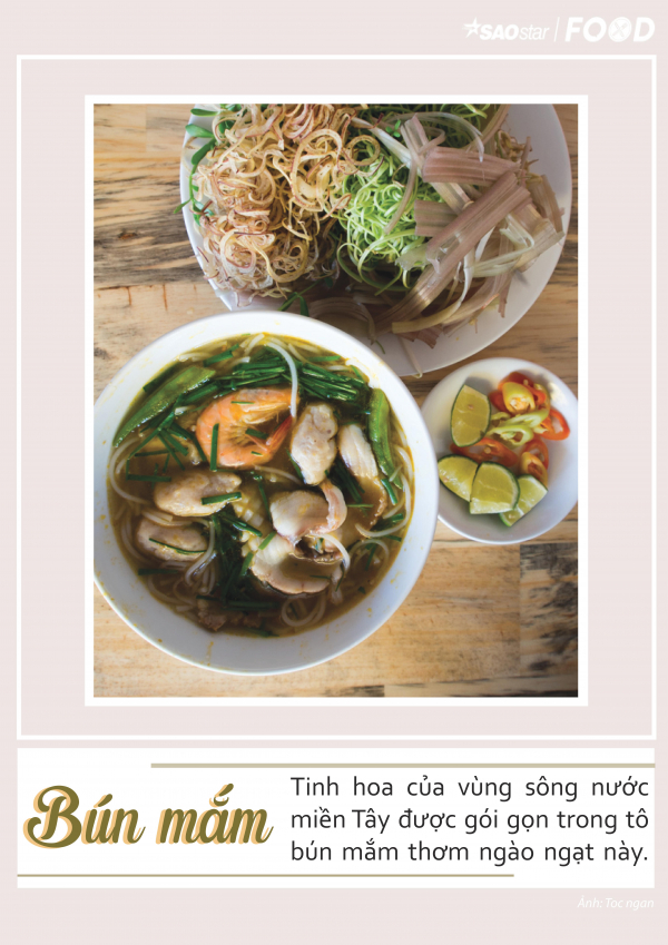Bún mắm ngon ở phần nước dùng đậm đà làm từ mắm cá, đặc sản của miền Tây Nam Bộ, cá linh hoặc cá sặc. Nấu con mắm cho thật rã rồi lọc lấy nước, nêm thêm đường và sả, ăn kèm cùng rau đắng, bắp chuối, rau muống, rau diếp cá và bông súng. Để tăng thêm hương vị cho món ăn, vài lát cá, tôm tươi, mực và heo quay cũng được dọn lên cùng bún.