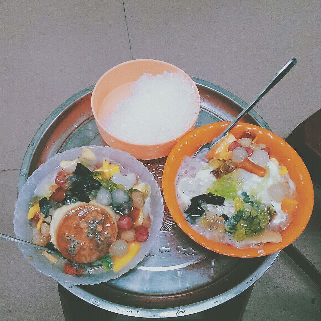 Hoa quả dầm ở đây khá lạ, các loại hoa quả gồm mít, xoài, ổi, dưa hấu, táo, chuối, dâu… lại với nhau. Nước cốt dừa cũng là do cửa hàng tự chế biến theo hương vị đặc biệt.