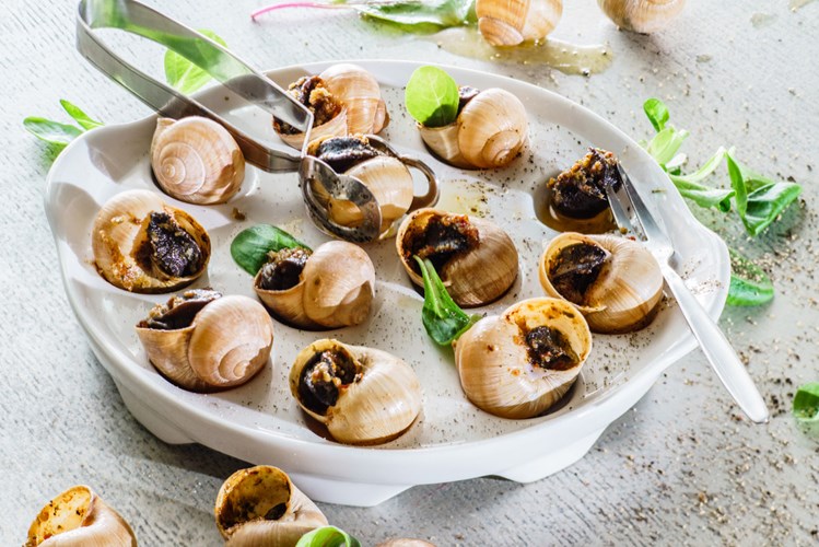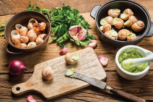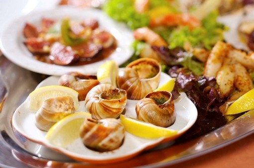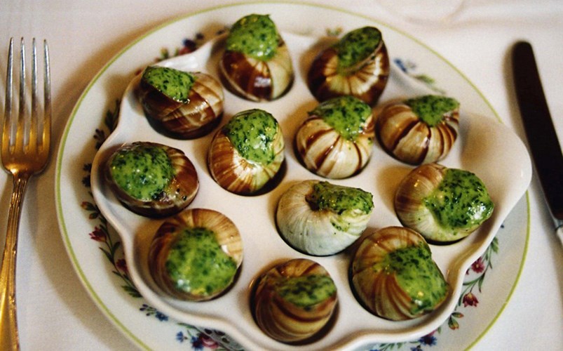 Một trong những món truyền thống làm nên danh tiếng cho sự sáng tạo của ẩm thực Pháp là ốc sên nướng bơ, tỏi, mùi tây.