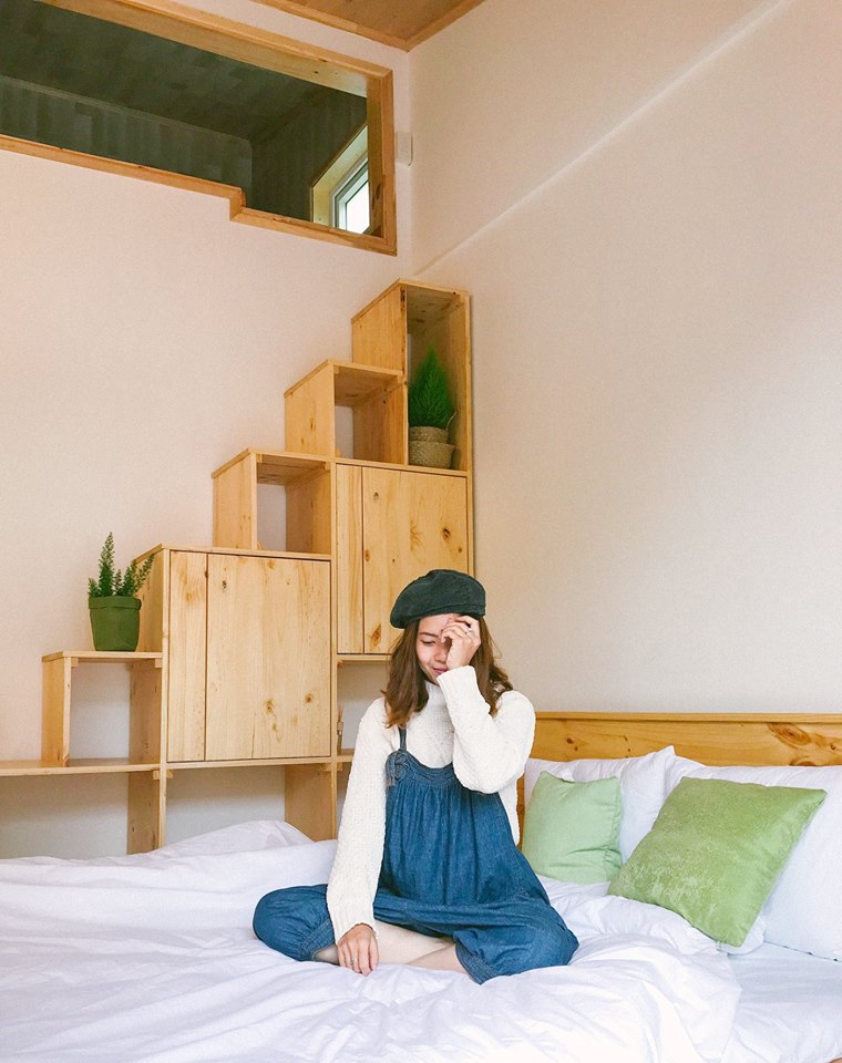Hầu hết các phòng ở Émai đều được bày trí theo tông màu trắng cổ điển chủ đạo. Trên tầng áp mái là một căn phòng nhỏ với ô cửa kính trên đầu, tầng lửng là hai căn phòng bé bé xinh xắn. Mọi thứ ở đây đều được thiết kế theo phong cách tối giản, gon gàng nhưng vẫn đủ tiện nghi. Vừa đủ nhỏ gọn, ấm cúng, nhưng cũng vừa đủ rộng rãi thoải mái để các cặp đôi, gia đình nhỏ tận hưởng sự riêng tư.