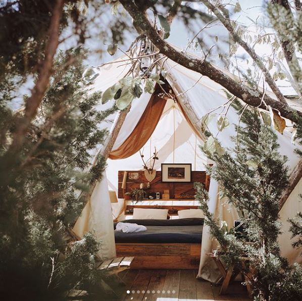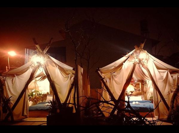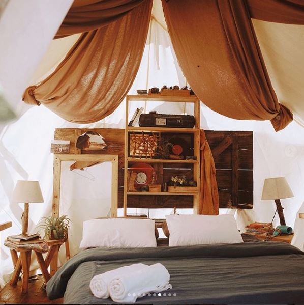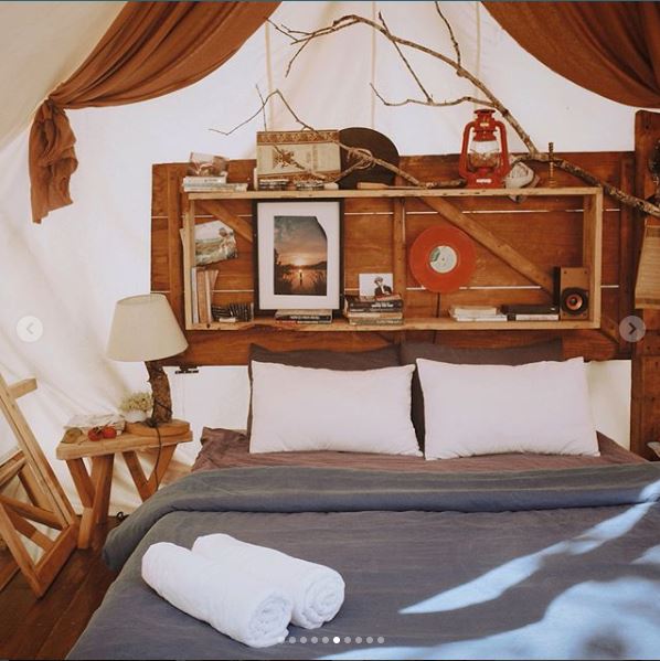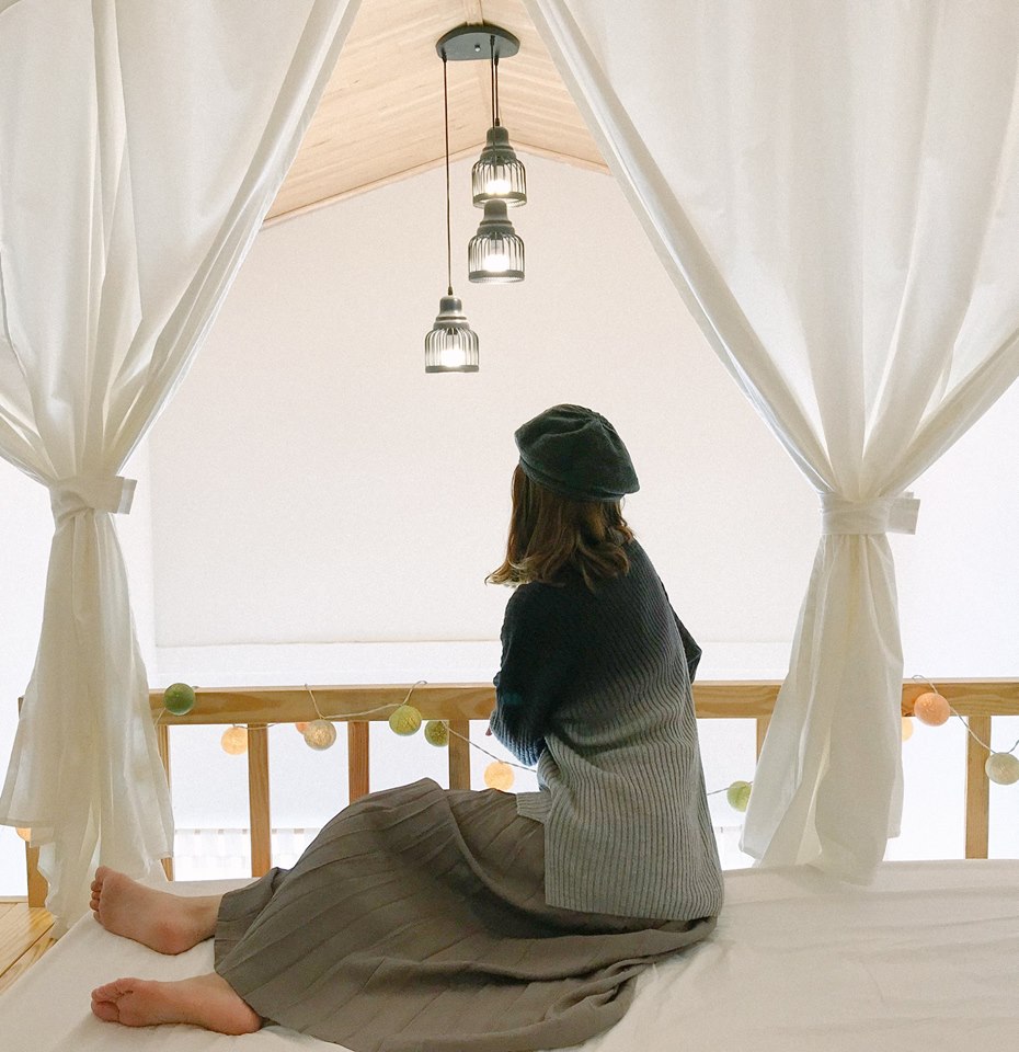 Vẫn theo xu hướng gần gũi với thiên nhiên, các căn phòng dạng lều ở đây được đặt nằm len lỏi trong khu vườn hồng, dựng trên những mảng sàn gỗ lớn với đồ đạc được bày trí đơn sơ, đơn giản. Những căn phòng lều này tuy chỉ vừa đủ không gian sinh hoạt cho hai người, nhưng mọi thứ đều được sắp xếp gọn gàng, hài hòa với căn lều trắng tràn ngập ánh đèn vàng ấm áp.