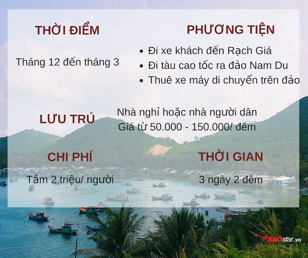 Từ Sài Gòn, bạn có thể bắt xe khách đến thành phố Rạch Giá, sau đó đón chuyến tàu cao tốc sớm ra đảo Nam Du. Bạn nhớ xem thông tin về thời gian tàu chạy để canh giờ hợp lí nhé. Ở đảo chỉ có những nhà nghỉ bình dân hoặc nhà người dân để lưu trú, như vậy bạn sẽ dễ dàng hoà mình vào nét sinh hoạt, đời sống của họ hơn. Người dân Nam Du rất hiếu khách, nhiệt tình, nên nếu muốn cần những dịch vụ, tham khảo địa điểm du lịch nào thì cứ hỏi họ sẽ rõ ràng hơn.