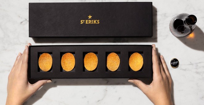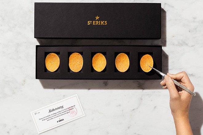 Giá chính thức của hộp khoai tây chiên sang trọng mang thương hiệu St. Erik này là 56 USD (khoảng 1.270.000 đồng). Thế nhưng, điều đáng ngạc nhiên hơn nữa là hộp khoai tây chiên này chỉ có vỏn vẹn có 5 miếng. Tức là tính ra, mỗi miếng khoai tây chiên như thế sẽ có giá hơn 11 USD (khoảng 250k). Đến đây thì bạn đã biết vì sao khách hàng nào cũng ngạc nhiên khi biết mức giá “khủng” của hộp khoai tây chiên này rồi nhé. Vậy khoai tây chiên thương hiệu St. Erik có gì đặc biệt mà lại có giá cao bất ngờ đến thế?