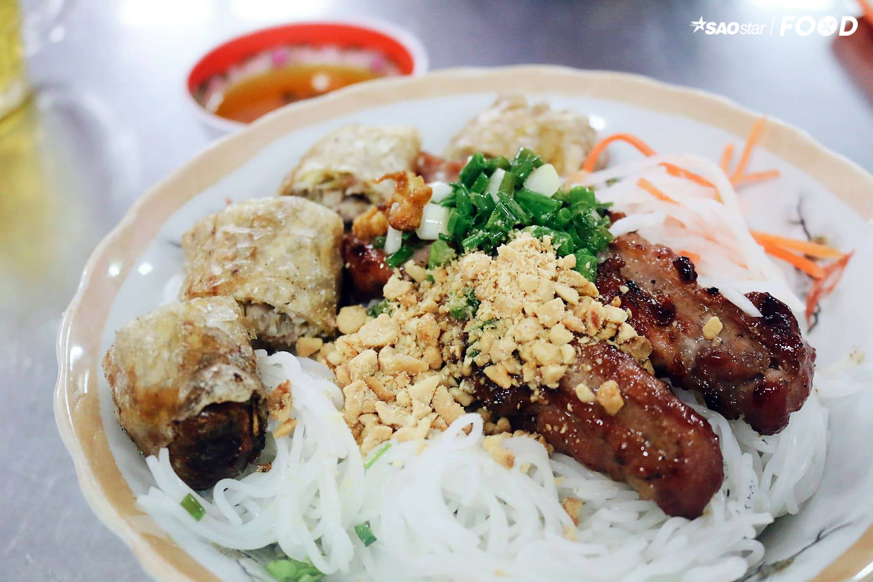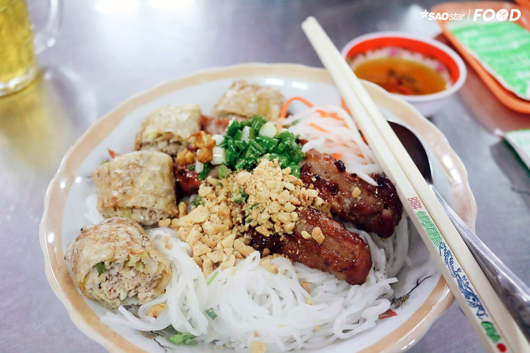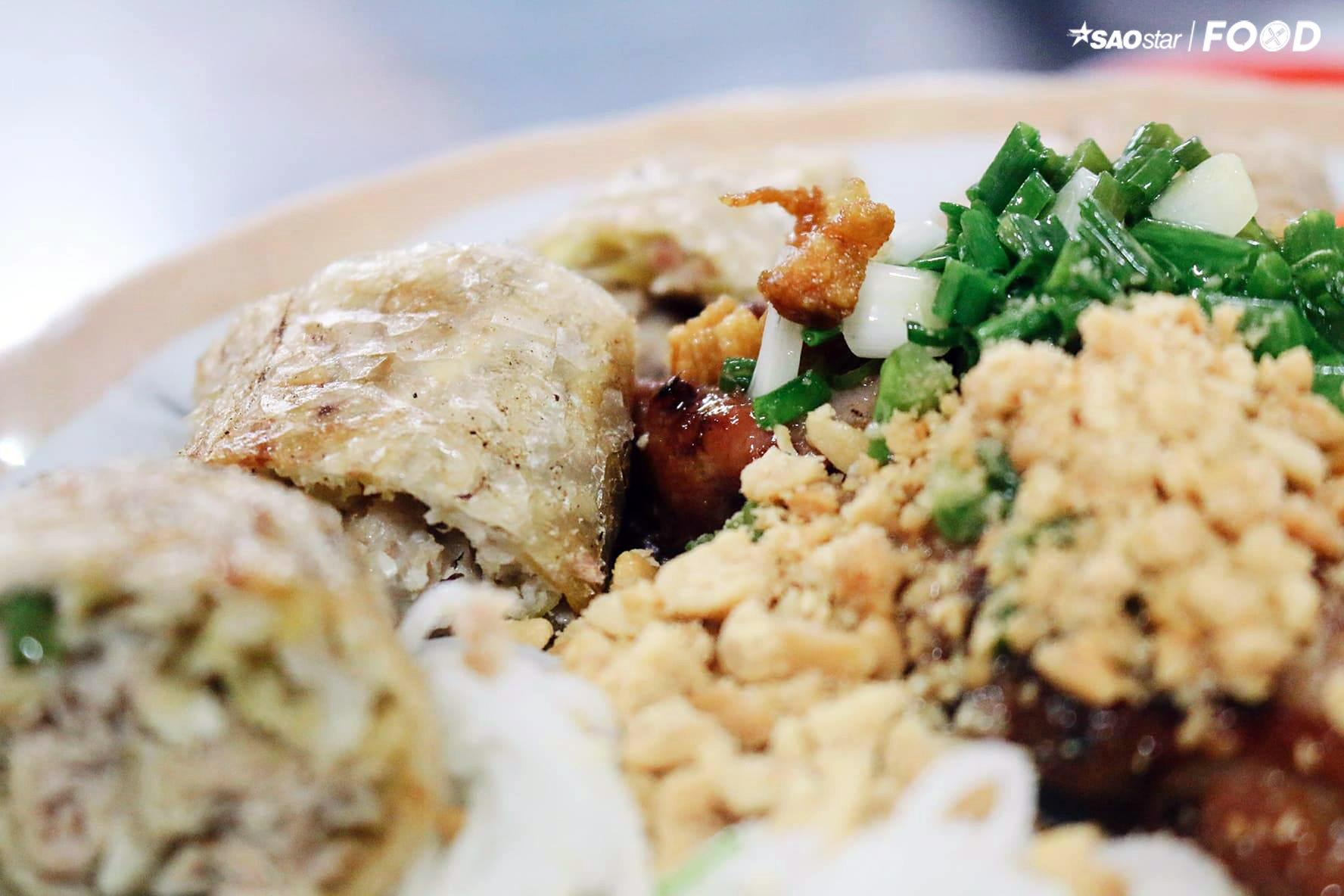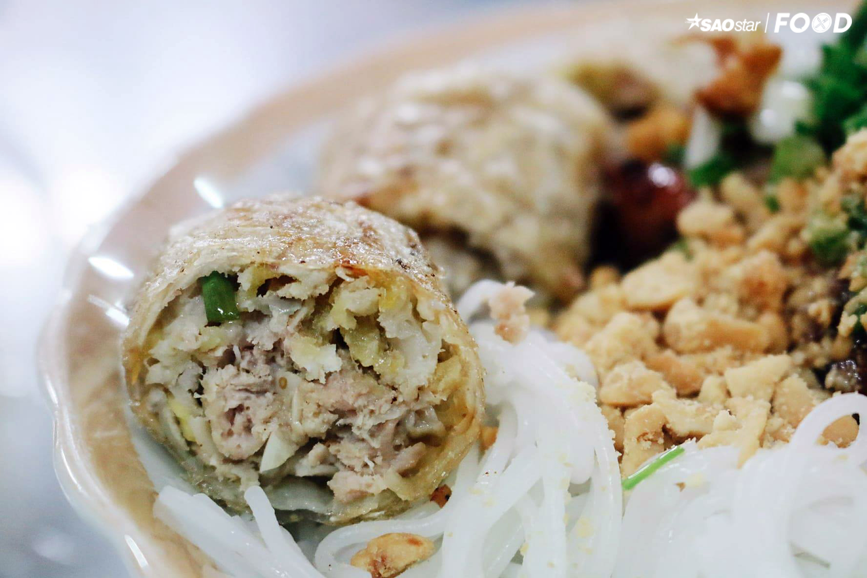 Phần ăn tại đây rất đầy đặn gồm bún tươi, rau sống, chả giò, nem nướng cùng đồ chua, mỡ hành và ít đậu phộng rang. Chả giò cây khá lớn và chất lượng, được cuộn rất chặt tay và chiên vừa tới, vàng ruộm, giòn tan. Nhân được trộn kỹ, nêm nếm đậm đà, độ ngon vừa tới, các nguyên liệu thịt, nấm, hành tỏi và đậu xanh quện đều với nhau, chắc nịch. Chả giò chiên tuy không phải là thức quà lạ miệng nhưng không nhiều quán phục vụ món ăn với chất lượng ổn như vậy.