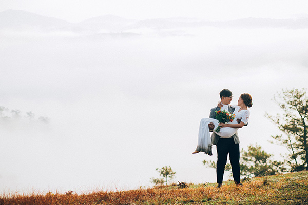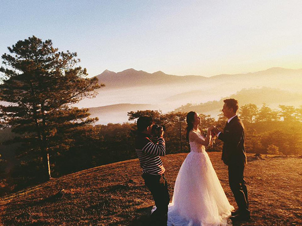 Những ngày này, trên ngọn đồi Thiên Phúc nhiều bạn trẻ, cặp đôi đã lựa chọn đây là điểm dừng chân cho những bộ ảnh kỷ niệm. Với những nhiếp ảnh gia, họ lựa chọn đến đây săn khoảnh khắc mây vờn núi hay bối cảnh thành phố chìm trong màn sương. Khi ánh nắng vừa lên xen giữa làn mây hay ánh đèn thành phố len lỏi trong tầng mây, khi ấy bạn bỗng thấy yêu mảnh đất này đến kỳ lạ. Ảnh: Phan Anh Tuấn