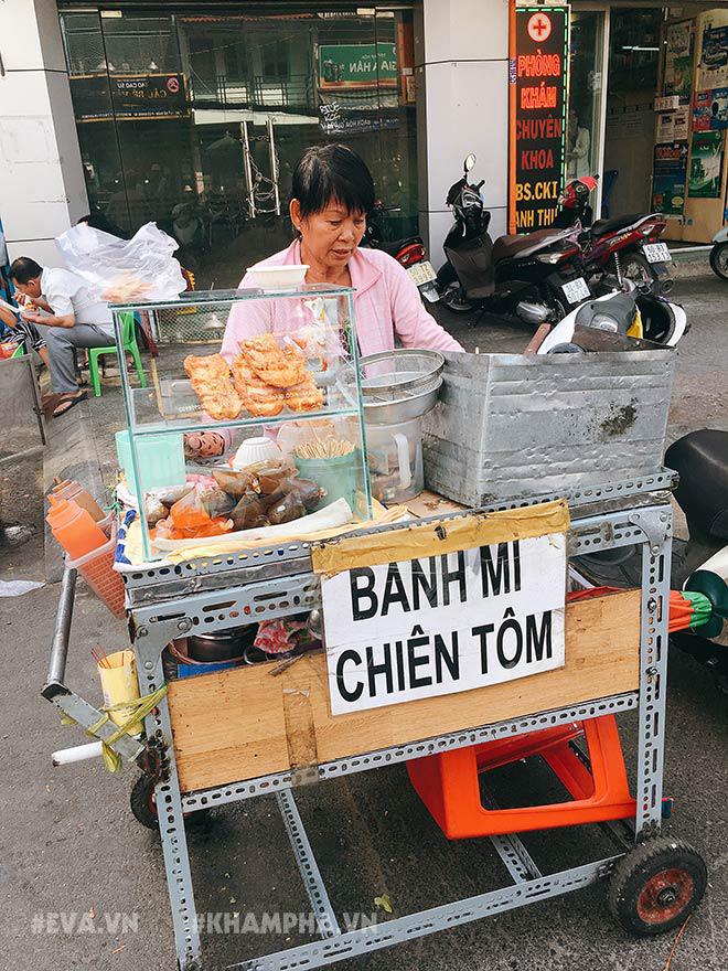 Xe bánh mì chiên tôm nhỏ nhắn xuất hiện mỗi sáng ở góc đường Đề Thám quận 1.