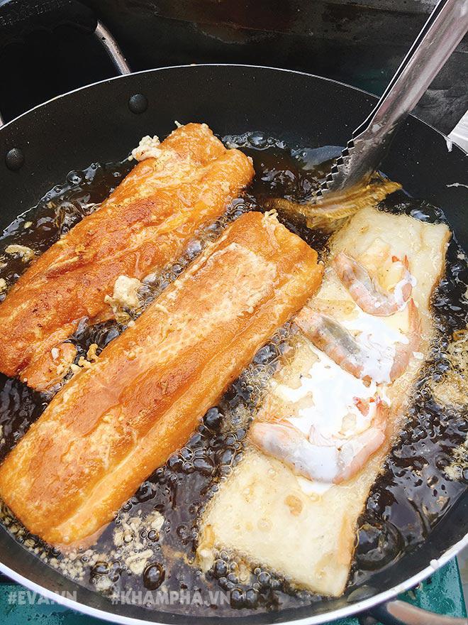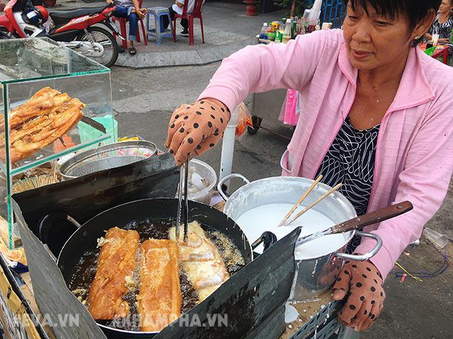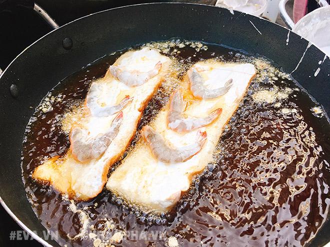 Cắt một nửa chiếc bánh mì, nhúng qua bột ướt, đặt lên 3 con tôm to bằng lòng bàn tay người lớn, cô Nguyên từ từ thả vào nồi dầu sôi sủi tăm. Chỉ vậy thôi mà người đi ngang bất kể “Tây”, “Ta” đều phải ngoái lại vì hương tôm chiên thơm lừng ở xe bánh của cô Nguyên.