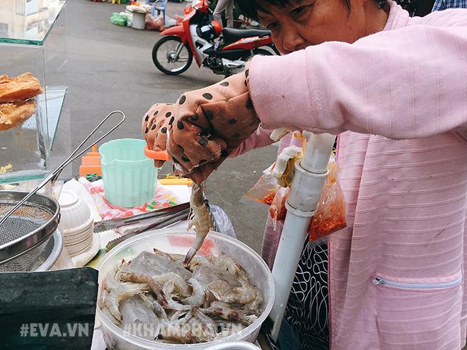 Xe bánh mì của cô không có pate, bơ, chả… như những hàng khác mà chỉ vỏn vẹn một rổ bánh mì, một thau dầu to để chiên và một hộp nhựa đựng đầy những con tôm tươi rói. Cô bán món ăn sáng vỉa hè độc nhất khu phố Tây mang tên: bánh mì chiên tôm.