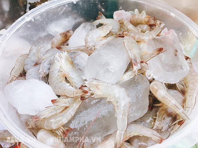 Tôm được cô mua loại ngon, rửa sạch ướp đá để giữ nguyên vị ngọt.