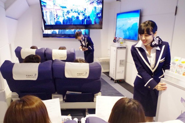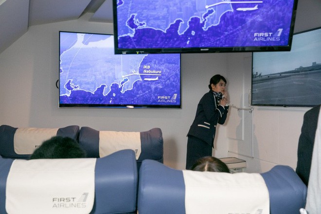 Trụ sở của First Airlines được đặt tại Ikebukuro, Tokyo. Khi đến với chuyến bay thực tế ảo, hành khách sẽ nhận thẻ lên tàu, sau đó được hướng dẫn vào một căn phòng được thiết kế như khoang hạng nhất của một chiếc máy bay Airbus hiện đại.