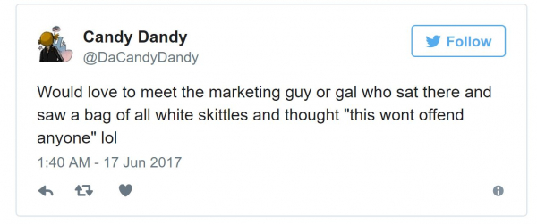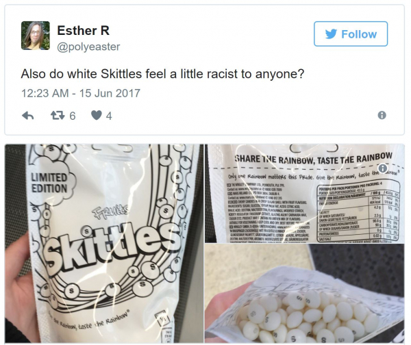 Bên cạnh những ý kiến cho rằng hành động của Skittles mang tính nhân văn cao, dũng cảm bỏ đi màu sắc vốn có của mình để dành chỗ cho sự ủng hộ đối với cộng đồng LGBT thì cũng có những ý kiến trái chiều đi ngược lại với dự tính ban đầu của hãng. Không ít những khách hàng cho rằng màu trắng, màu của phiên bản đặc biệt này, ở một mặt khác, lại mang ý nghĩa phân biệt chủng tộc. Tuy nhiên, không thể phủ nhận được sự cố gắng của hãng cũng đã tạo nên một tiếng nói khá lớn mang hướng tích cực đối với cộng đồng này.