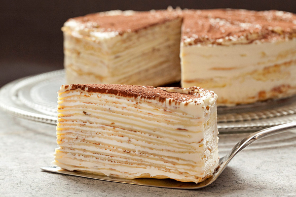 Bên cạnh các lớp bánh ladyfinger của chiếc Tiramisu truyền thống, thế giới bánh ngọt còn có những phiên bản thay thế rất sáng tạo và độc đáo như Tiramisu crepe cake - chiếc bánh mỏng dẹt được xếp rất nhiều lớp xen kẽ cùng hỗn hợp hương vị đậm đà của rượu và cà phê, béo ngậy của kem mascarpone.