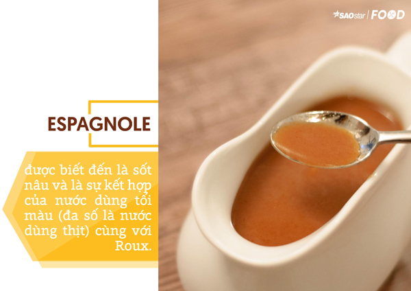 Sốt Espagnole còn được biết đến là sốt nâu và là sự kết hợp của nước dùng tối màu (đa số là nước dùng thịt) cùng với Roux. Loại sốt này được bắt đầu với các loại rau củ xào như cà rốt, cần tây và hành tươi, thêm vào ít nước dùng sau đó bột cà chua nhuyễn và các gia vị cơ bản sẽ được nêm nếm sao cho vừa miệng nhất. Sốt Espagnole là một sự lựa chọn tuyệt vời cho một bữa ăn tối với món thịt bò nướng cùng nấm, ít rau củ ăn kèm.
