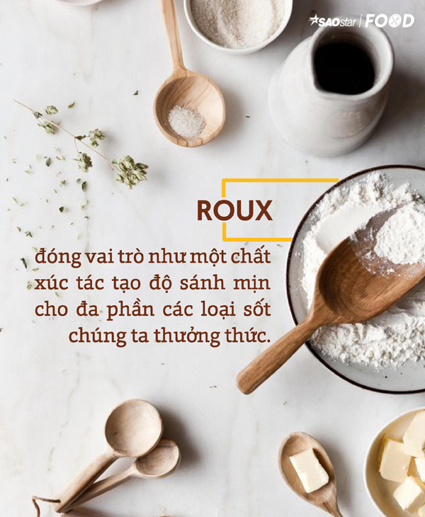Trước hết, ta cần làm quen với khái niệm Roux thường xuất hiện trong các công thức làm sốt. Roux là hỗn hợp bột mì kết hợp với chất béo khác như dầu ăn hoặc bơ và được dùng như một chất xúc tác tạo độ sánh mịn cho đa phần các loại sốt chúng ta thưởng thức.