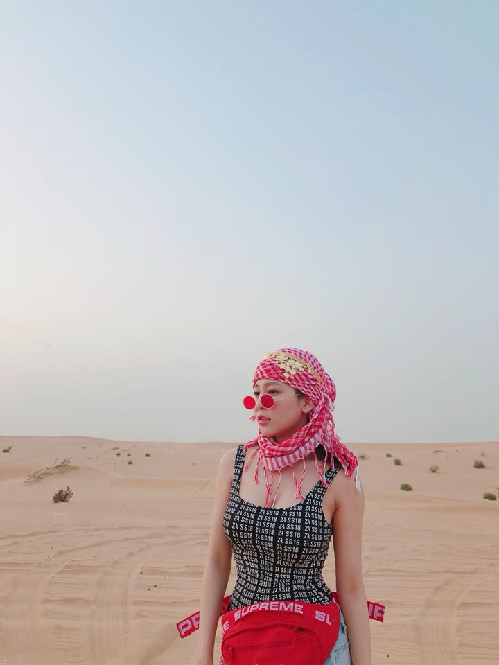 Trâm Anh cũng không bỏ qua chuyến du ngoạn đến sa mạc Safari. Safari là một phần của sa mạc Arab, gắn liền với tên tuổi “con đường tơ lụa” của các nhà buôn Trung Quốc. Chia sẻ về trải nghiệm đáng nhớ nhất ở Dubai, hot girl cho biết: “Mỗi ngày ở Dubai đều có rất nhiều kỷ niệm đáng nhớ nhưng mình ấn tượng nhất là khi được lái xe trên cát. Bề mặt cát không phẳng và bị lún khiến mình hơi sợ. Tuy nhiên khi đi quen rồi thì rất thích. Bạn nào muốn trải nghiệm cảm giác mạnh thì chắc chắn nên chơi trò này”.