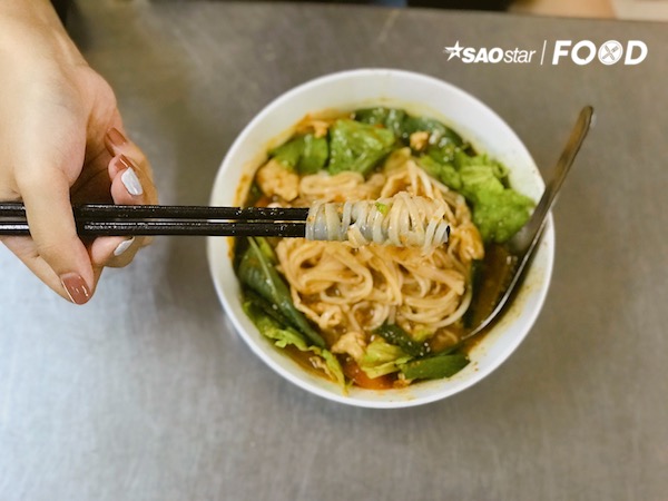 Sợi hủ tiếu dai và mịn, được cho khá nhiều trong tô. Ngon nhất phải kể đến phần nước dùng, là sự hoà quyện giữa cái béo bùi của đậu phộng xay nhuyễn, nêm thêm vị đậm của tương đen tạo nên độ sệt hợp lí. Sa tế nhấn nhá thêm vị cay nồng cho món ăn. Trong mỗi tô hủ tiếu là sự cân bằng đây đủ hương vị, ngọt, béo, cay đậm đà và hấp dẫn vô cùng.