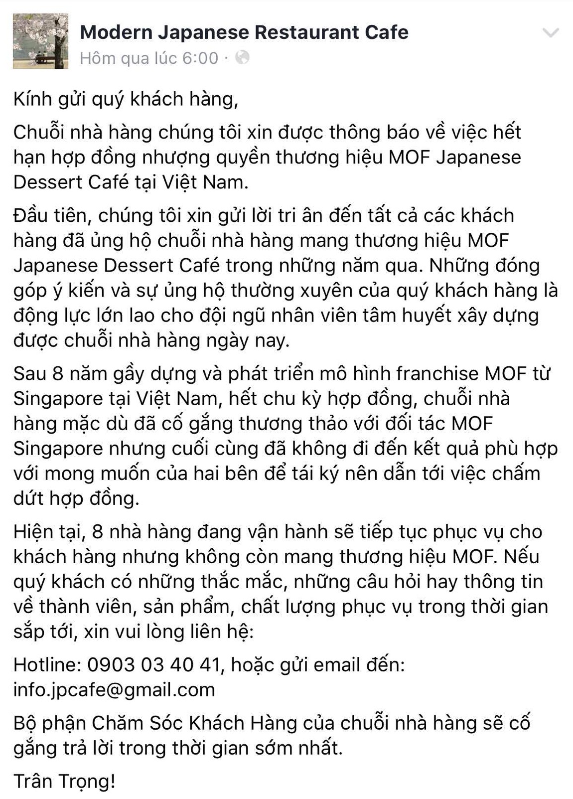 Vừa qua( 22/04), một thông báo đã được đăng tải trên trang facebook của chuỗi nhà hàng MOF. Thông báo này đã khiến cho một lượng lớn các tín đồ ẩm thực bàng hoàng vì quá đỗi đột ngột. Dưới đây là nguyên văn của MOF gửi đến các thực khách của mình: