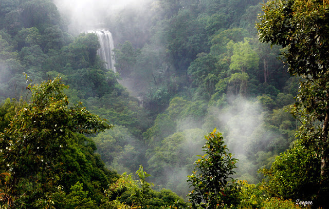 Từ đỉnh đèo, hướng mắt ra xa, cả đoạn đèo như thu gọn vào tầm mắt. Một bên đèo là vách đá, phía còn lại là rừng sâu thăm thẳm.