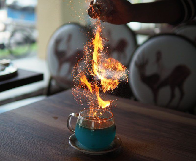 Tương tự như thế, ly cocktail có màu xanh nước biển đẹp mắt cũng có khả năng bốc lửa giống như đang có người sử dụng phép thuật tại quán. Và chính nhờ điều này, các bạn trẻ khi đến Platform 1094 đều rất thích thú với màn tự biểu diễn phép thuật cùng cây đũa thần và ly cocktail.