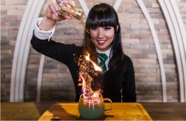 Chưa dừng lại ở cách thiết kế, bày trí quán mà Platform 1094 còn khiến nhiều khách hàng bất ngờ khi phục vụ món cocktail phép thuật. Món cocktail này có tên là “Goblet of fire cocktail” (Ly cocktail lửa) được sáng chế ra nhằm tái hiện lại những phân cảnh các phù thủy sử dụng phép thuật của mình để làm bùng cháy ngọn lửa trong phim.